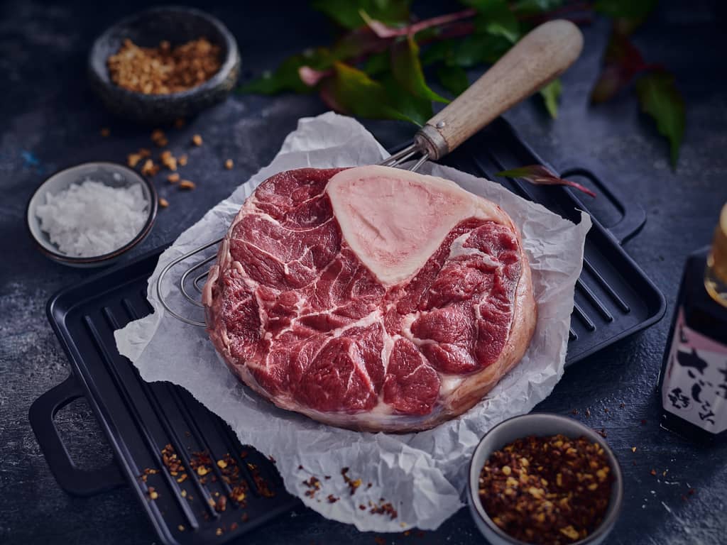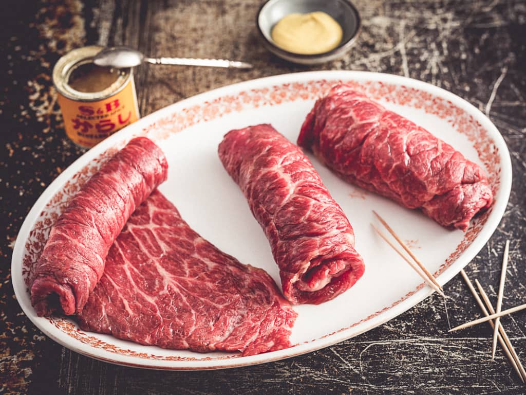 Außerhalb der Grillsaison schneidet man aus der Oberschale herzhafte Rouladen, die durch die sehr gute Marmorierung saftig und zart werden.