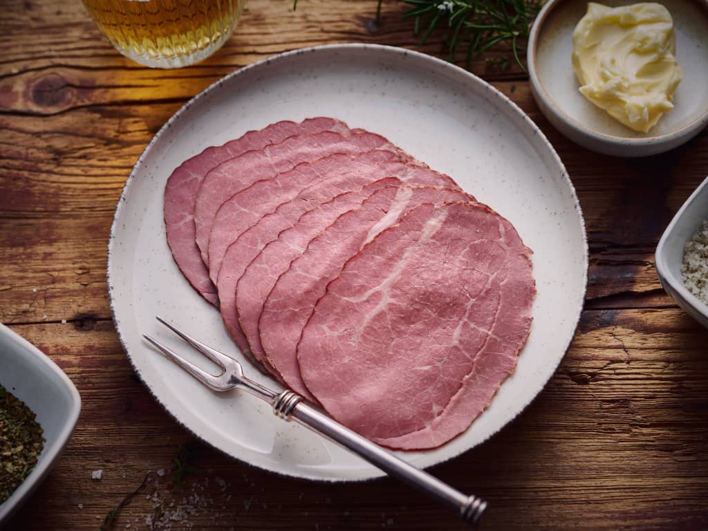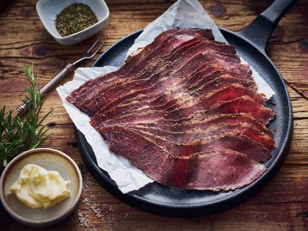 Pastrami ist gepökeltes, gewürztes und geräuchertes Rindfleisch. Zart, aromatisch und ideal für Sandwiches oder als Aufschnitt.