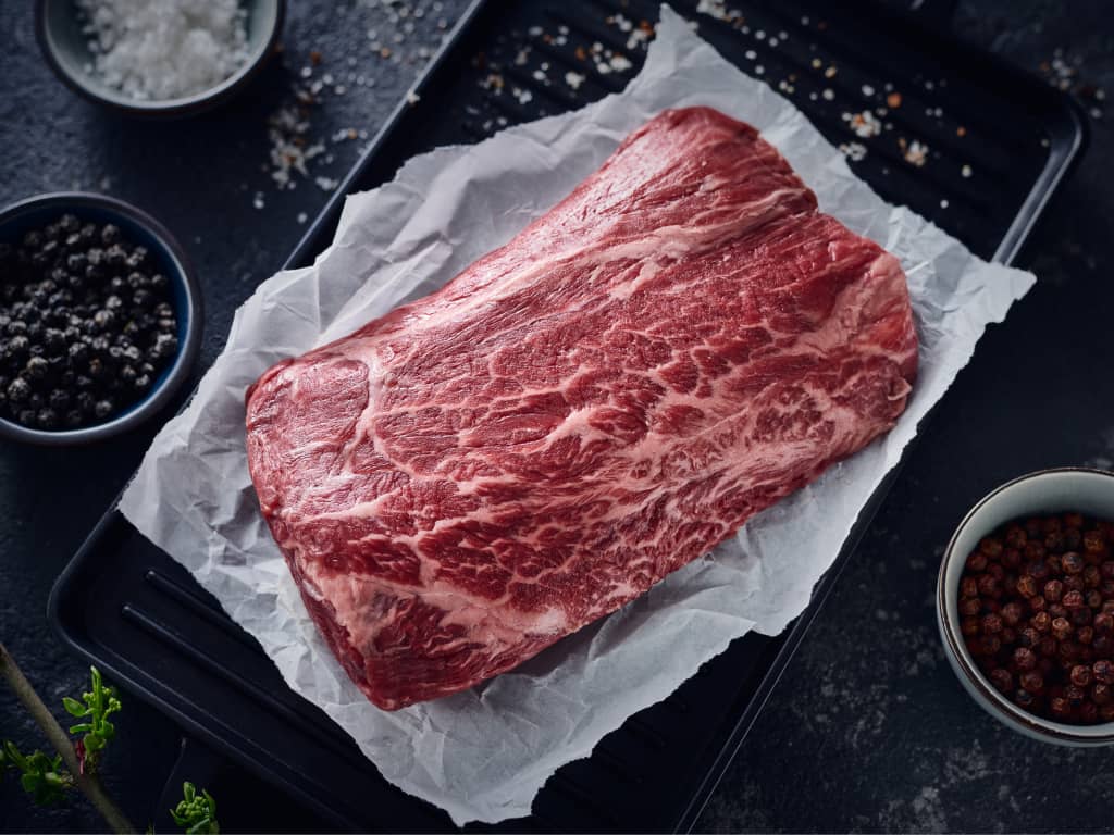 Das Flat Iron Steak wird aus dem oberen Teil der Schulter des Wagyu-Rinds geschnitten und eignet sich aufgrund der schönen Marmorierung hervorragend zum Kurzbraten.