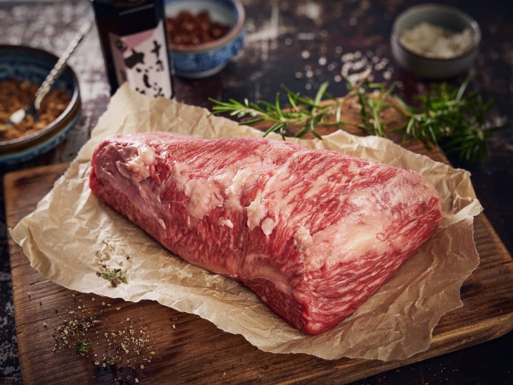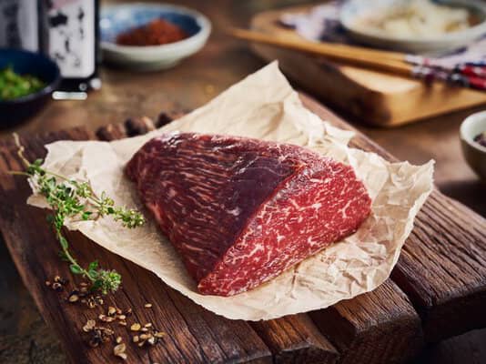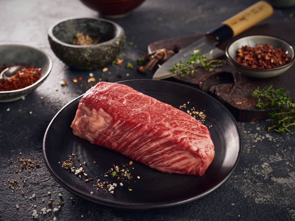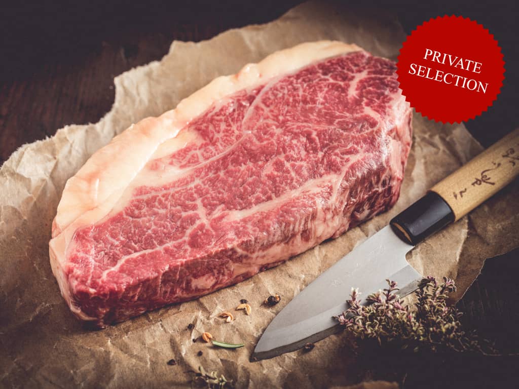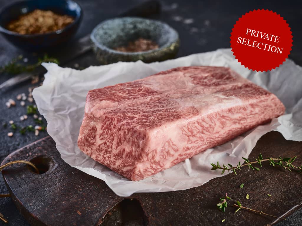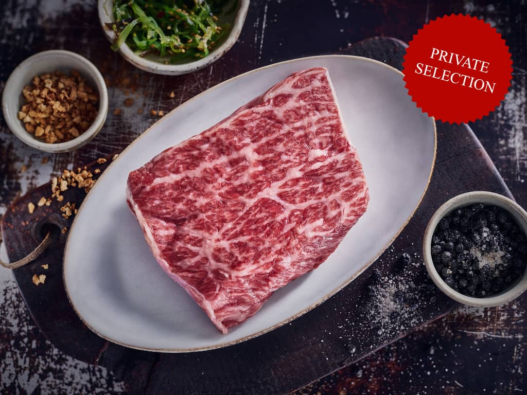 Das Roastbeef oder Rumpsteak wird aus dem Mittelteil des Rückens geschnitten. Charakteristisch für diesen Zuschnitt ist ein gleichmäßiger Fettrand am Wagyu Steak. Es ist feinfaserig und sehr zart mit einem buttrigen Schmelz.
