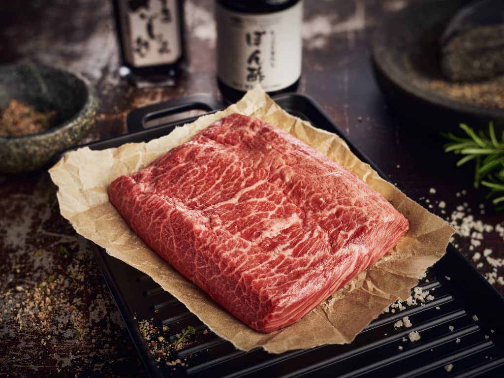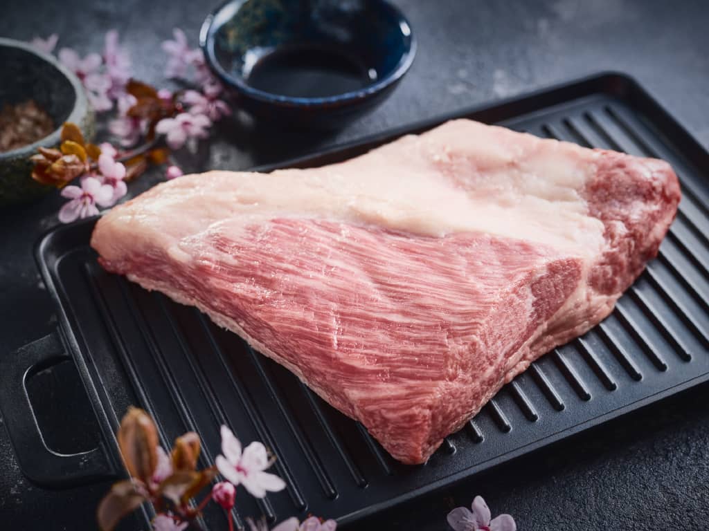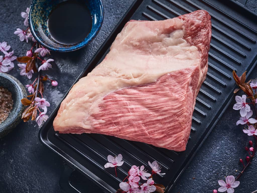 Das Wagyu Teppanyaki Steak liegt am unteren Hals und ist stark marmoriert. Es wird traditionell auf dem Teppanyaki-Grill in dünne Streifen geschnitten oder klassisch als Steak zubereitet.