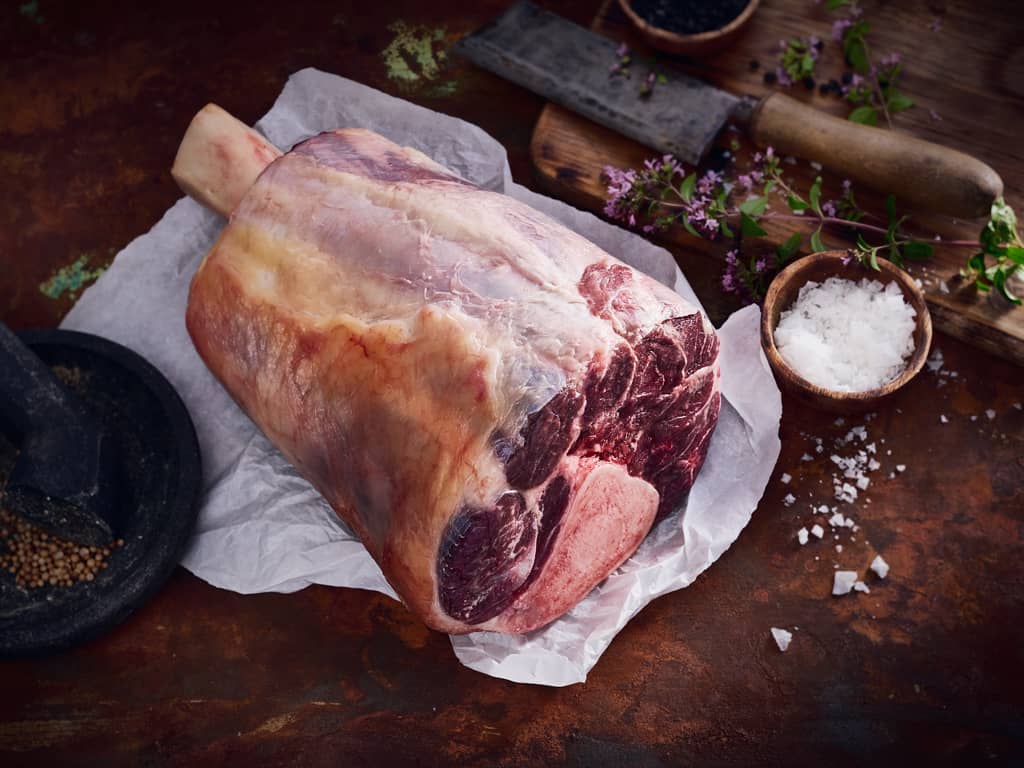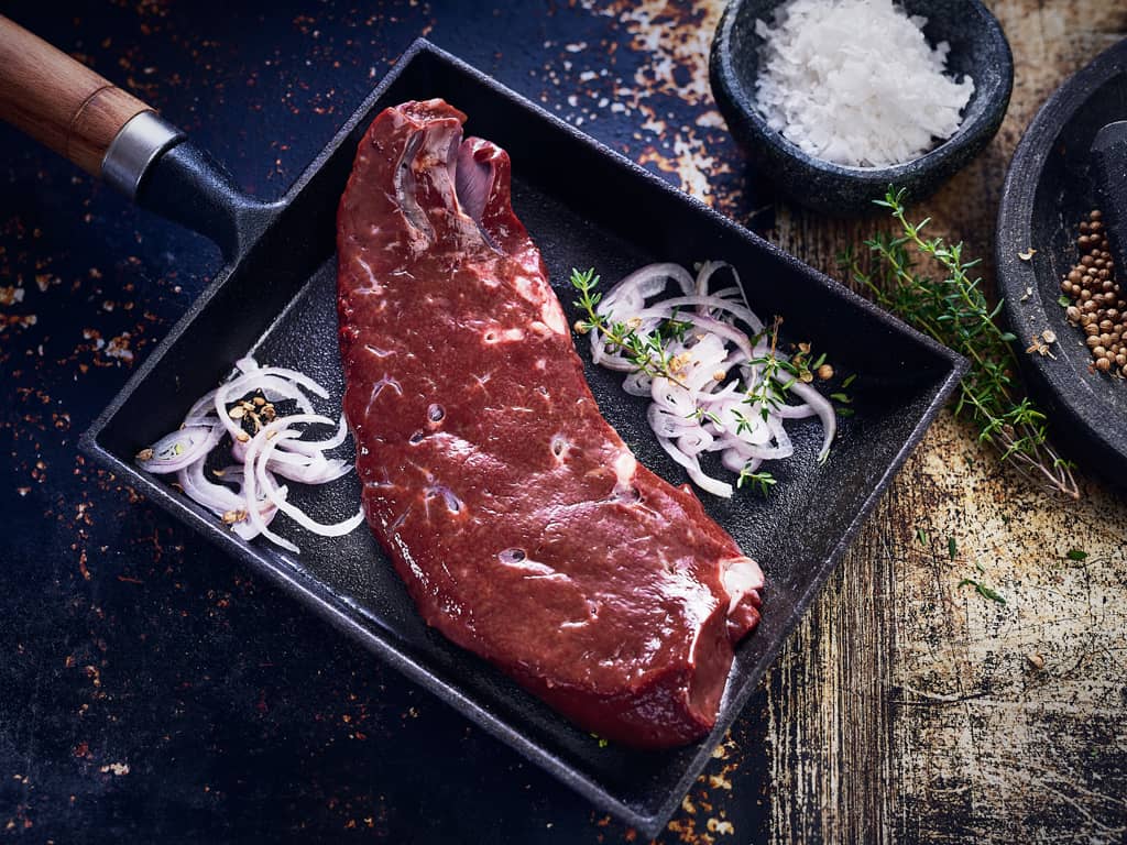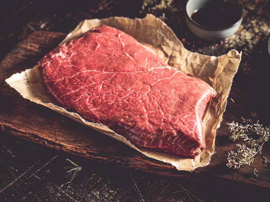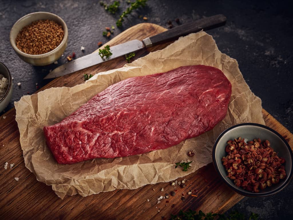 Außerhalb der Grillsaison schneidet man aus der Oberschale herzhafte Rouladen, die durch die sehr gute Marmorierung saftig und zart werden.