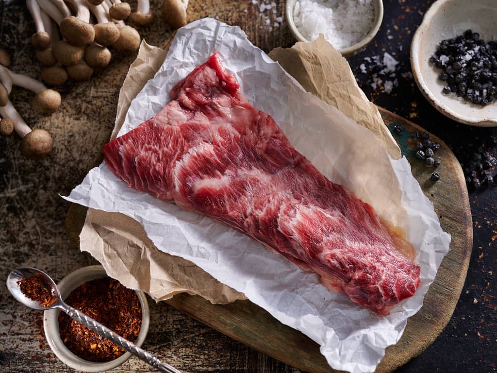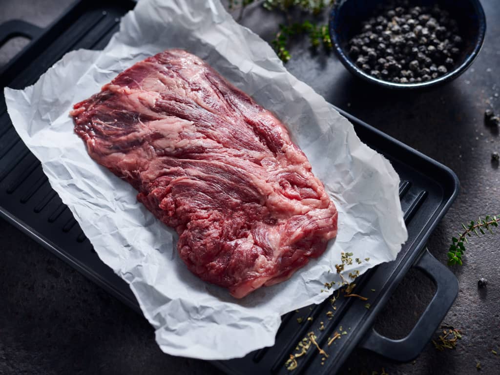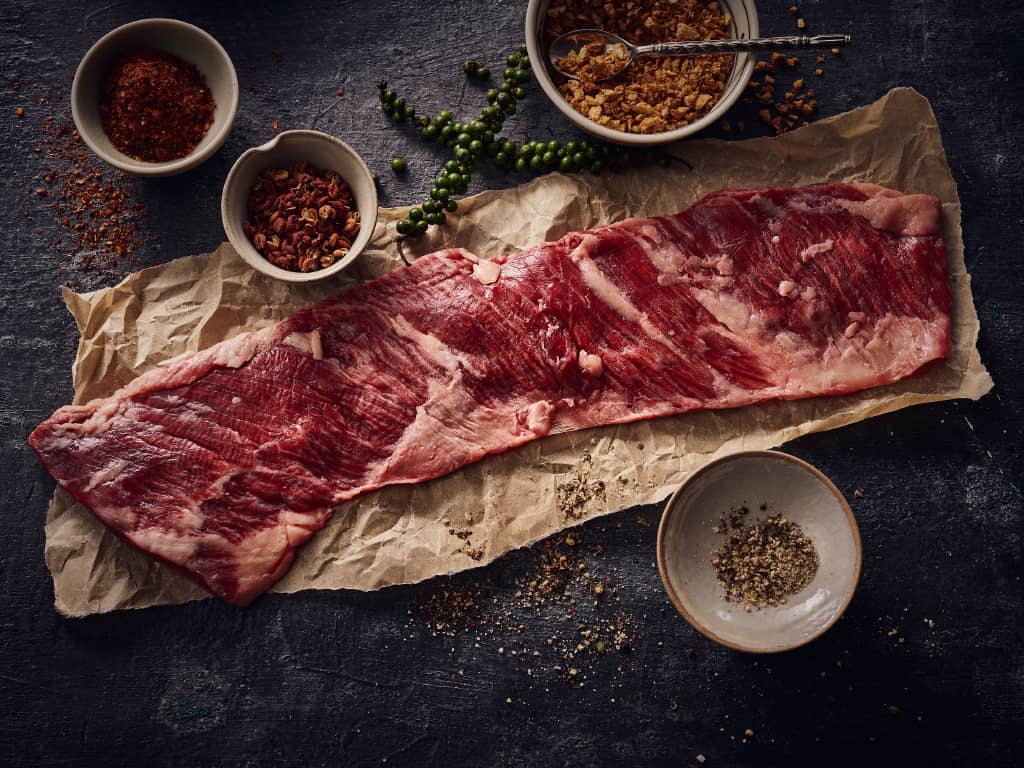 Das Skirt Steak (Zwerchfell) besteht aus einem kräftigen Muskel, der zwischen Magen und Lunge liegt. Es ist grobfaserig und fest und besitzt eine kräftige Marmorierung. Sehr kräftig und aromatisch im Geschmack.