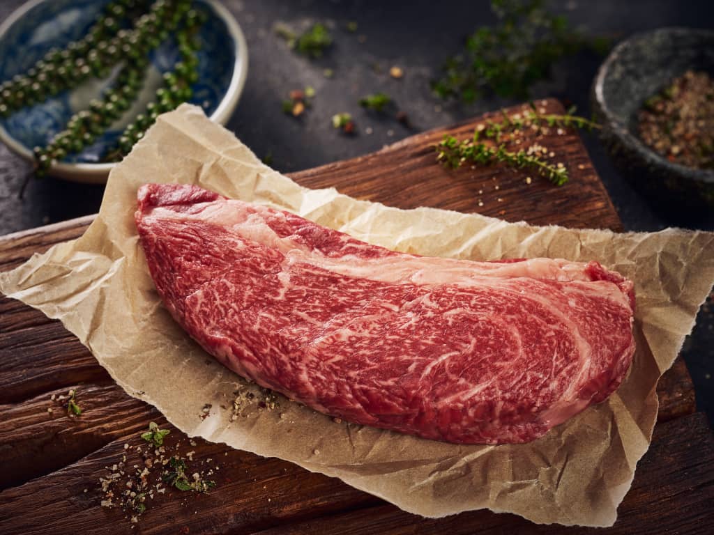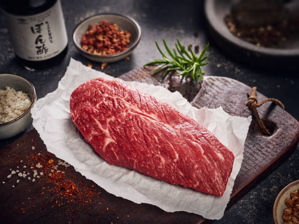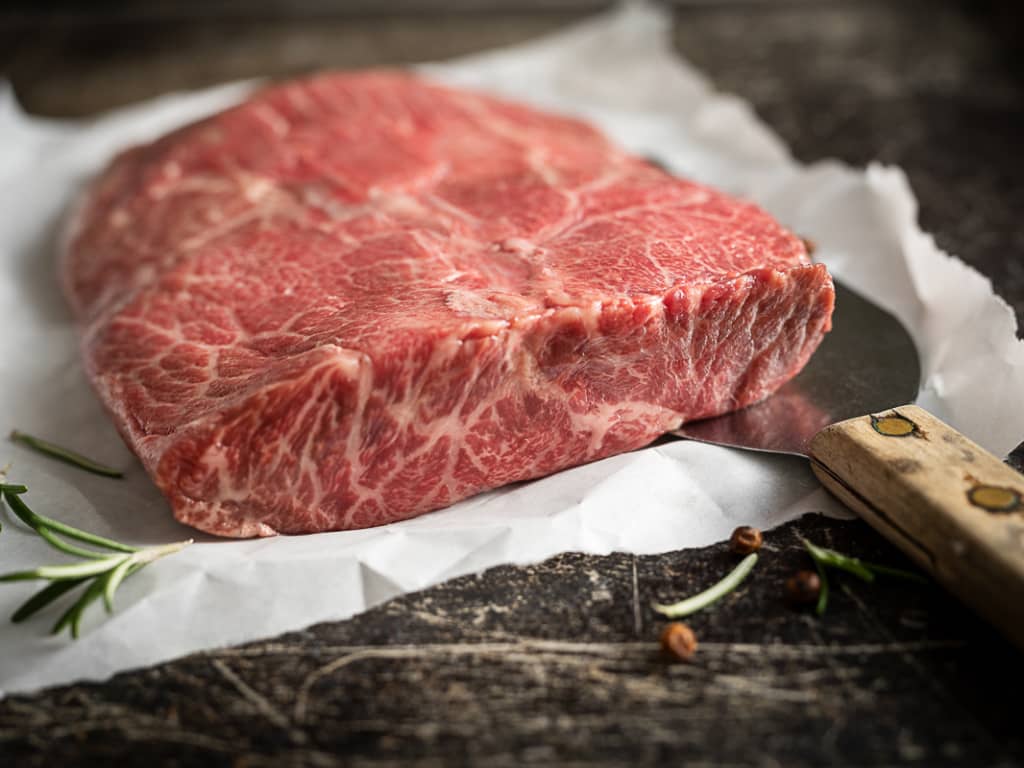 Das Flat Iron Steak wird aus dem oberen Teil der Schulter des Wagyu-Rinds geschnitten und eignet sich aufgrund der schönen Marmorierung hervorragend zum Kurzbraten.