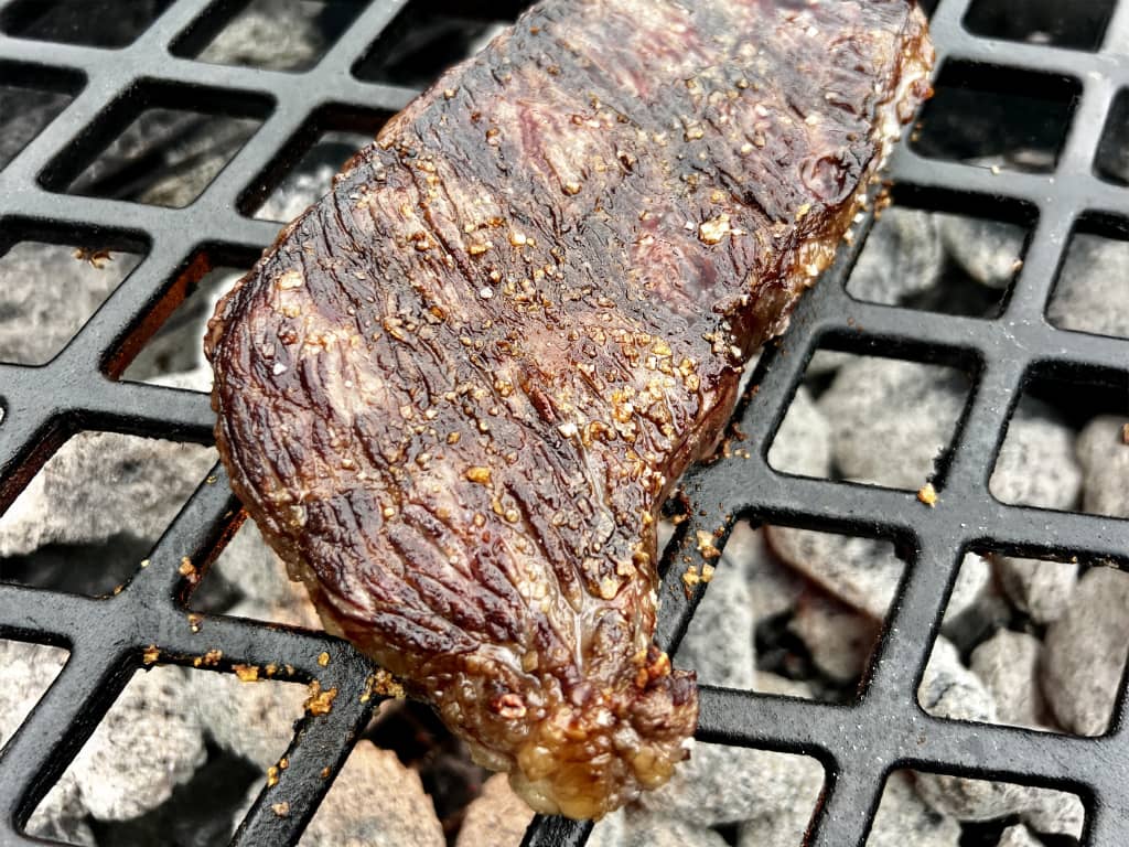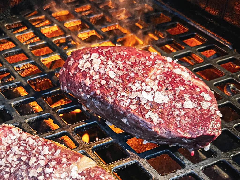 Bei hoher Hitze von beiden Seiten 2 Min. scharf angrillen/braten. Danach auf dem Grill in indirekter Zone – alternativ im Ofen – bei einer Temperatur von 110-120°C auf gewünschte Kerntemperatur ziehen. Dazu ein Fleischthermometer zu Hilfe nehmen. Vor dem Verzehr sollte das Fleisch noch ca. 4-5 Min. ruhen. Entgegen der Faser aufschneiden. Mit Salzflocken und grobem Pfeffer würzen.