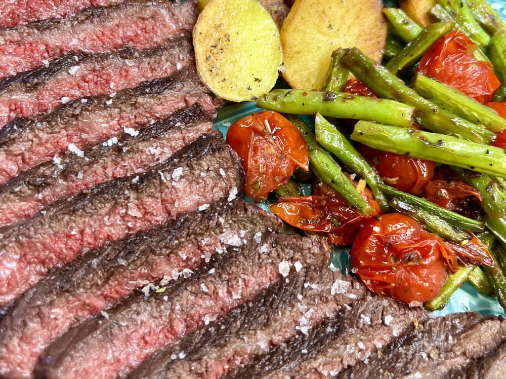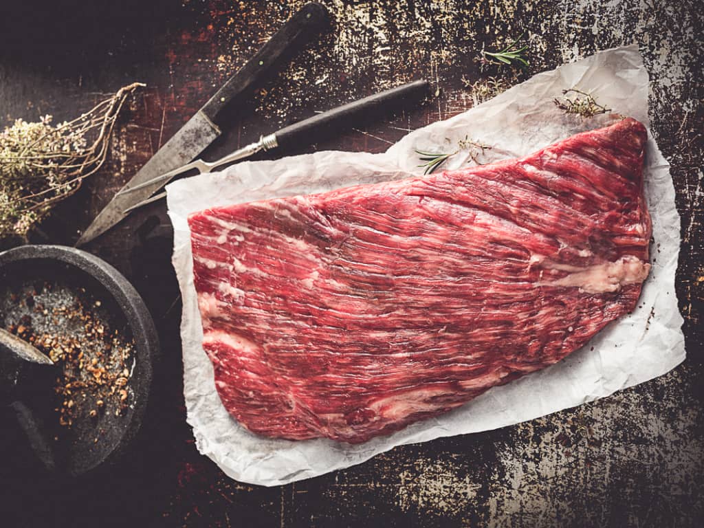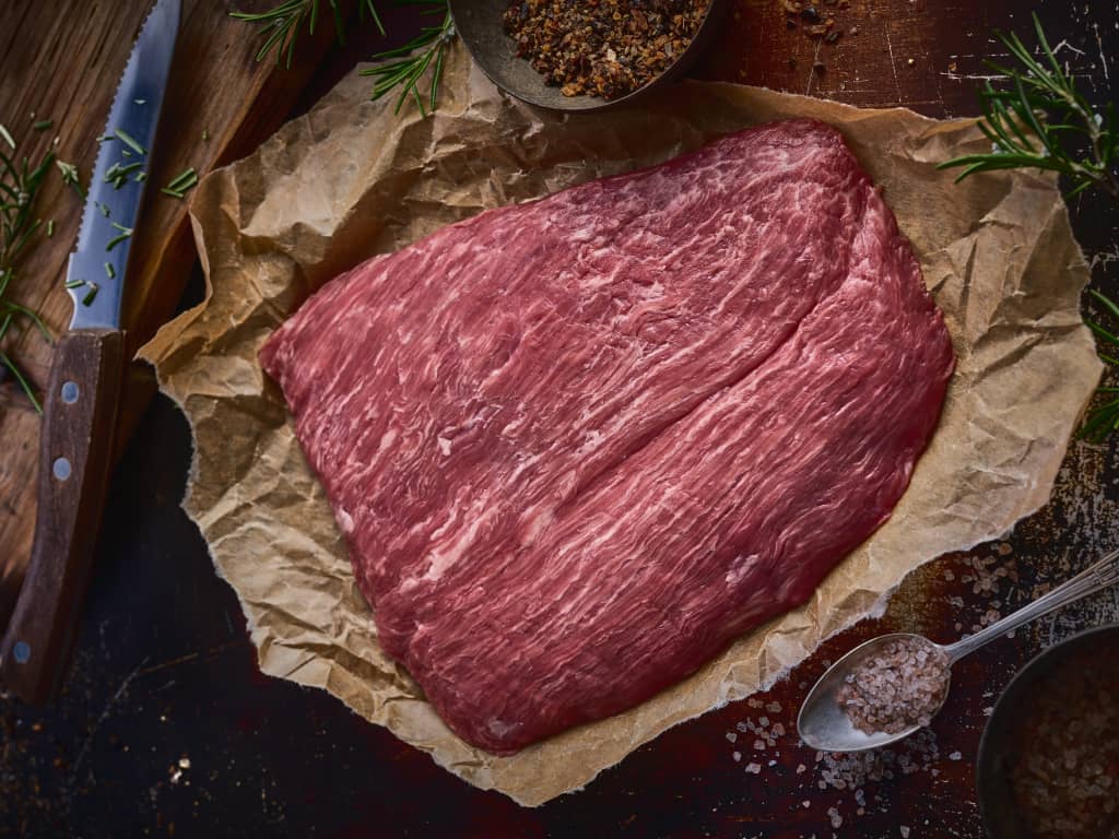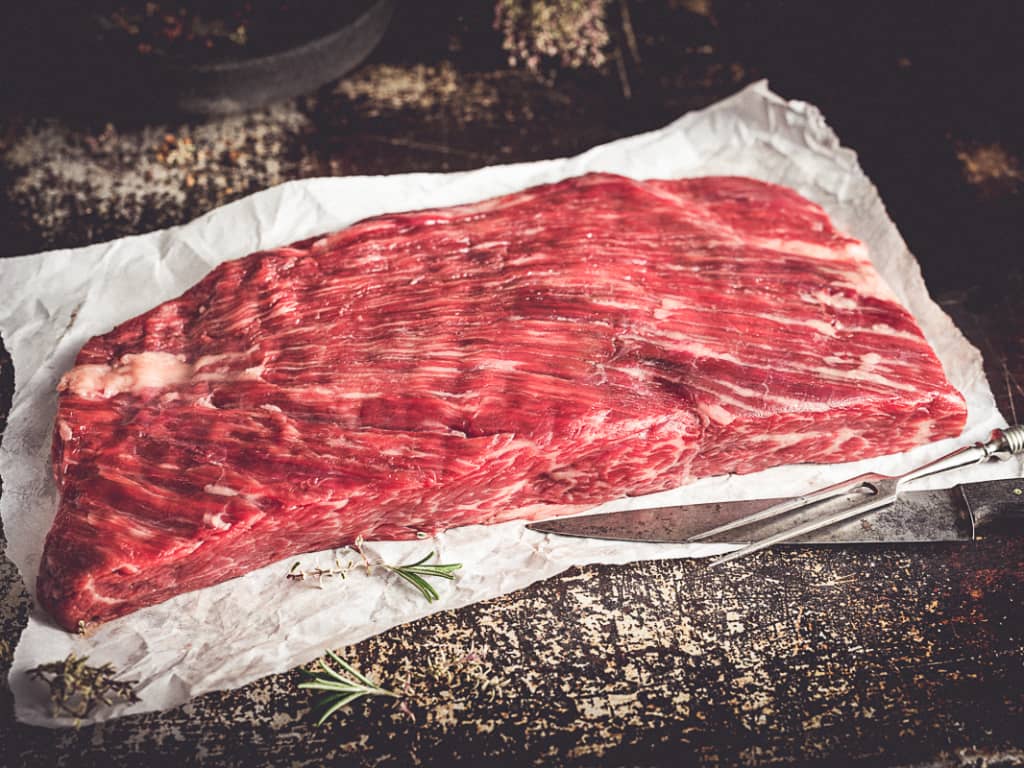 Das Flank Steak stammt aus dem Bauchlappen des Rindes. Es ist sehr saftig, langfaserig und hat einen festen Biss. Besonders auffällig ist die Schichtung von Fleisch und Fett.