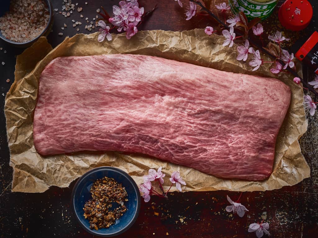 Das Flap Meat Steak vom Wagyu Rind ist bei uns noch relativ unbekannt. Es liegt zwischen Brisket und Flank und kann auch als „großer Bruder“ des Flank Steaks bezeichnet werden. Das Flap ist wie sein kleiner Bruder relativ grobfaserig und stark marmoriert. Zubereitung wie Flanksteak.