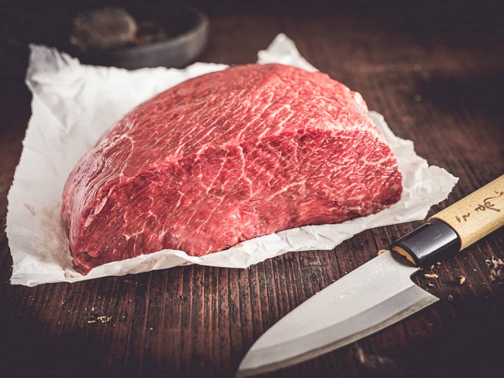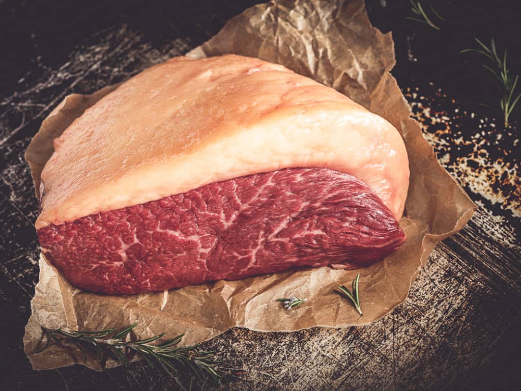 Der Hüftdeckel oder auch Tafelspitz genannt, liegt im hintersten Hüftbereich des Wagyu Rindes und besitzt eine ausgeprägte Fettdecke. Durch seine spitz zulaufende Form bekam es in Österreich den Namen „Tafelspitz“. Das Fleisch ist gleichmäßig fein marmoriert und kann im Ganzen zum Schmoren und Braten verwendet werden, oder als Steaks („Picanha“) zubereitet werden.