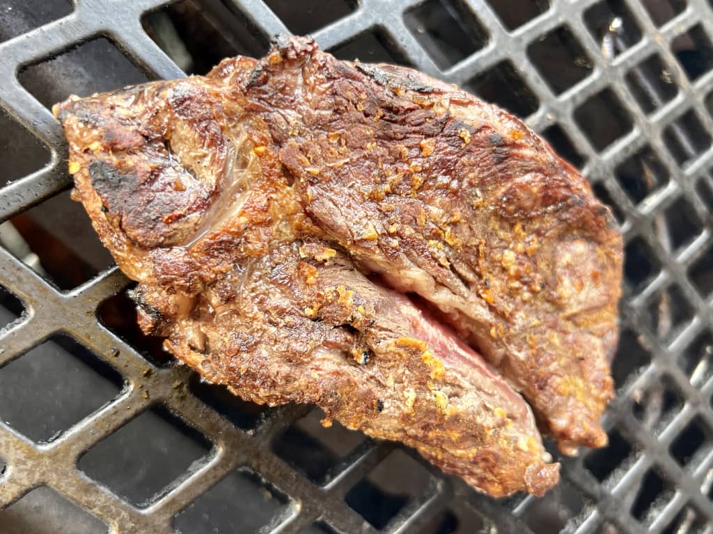 Grill: Das Steak von der direkten Hitze entfernen und in bei indirekter Hitze 110°C Kerntemperatur ziehen.