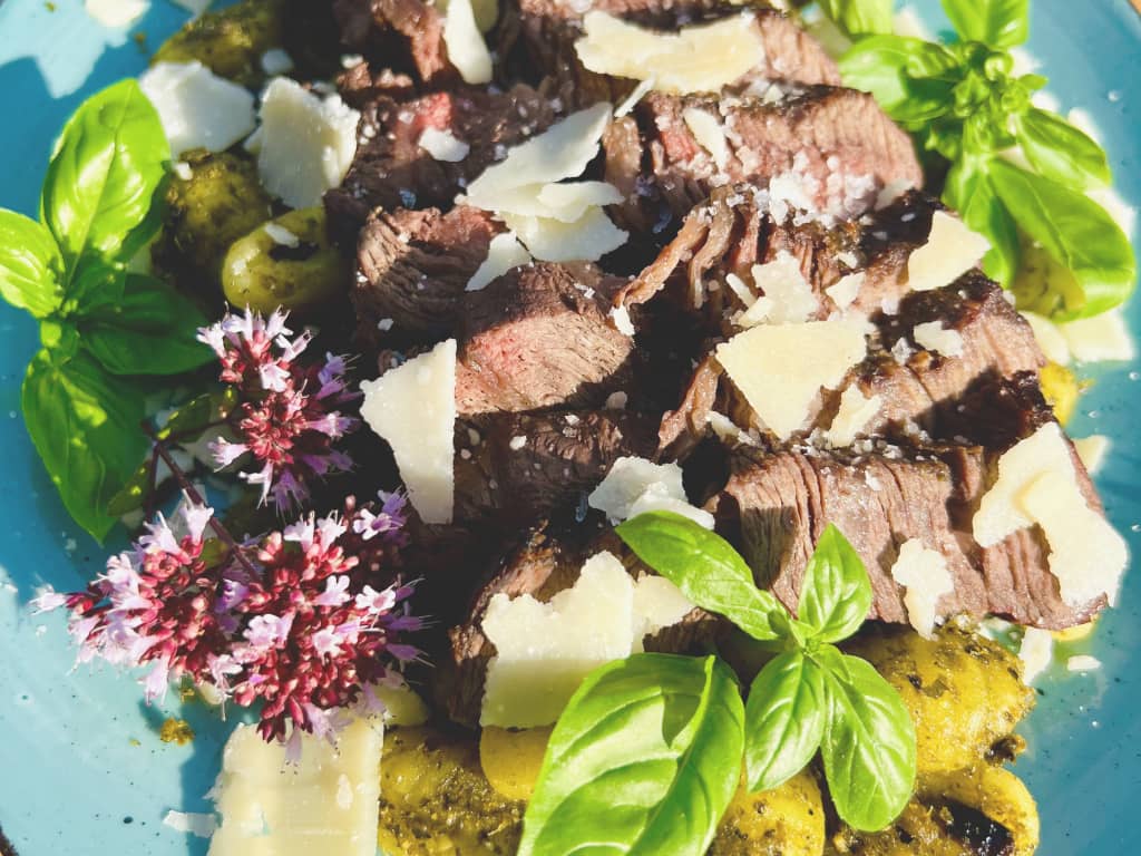 In der Pfanne oder auf dem Grill bei starker Hitze von beiden Seiten für 2-3 Min. anbraten/grillen. Dann im Ofen oder Grill (indirekte Zone) bei 80°C auf gewünschte Kerntemperatur ziehen. Dazu ein Fleischthermometer zu Hilfe nehmen. Vor dem Anschneiden 2-3 Min. ruhen lassen.