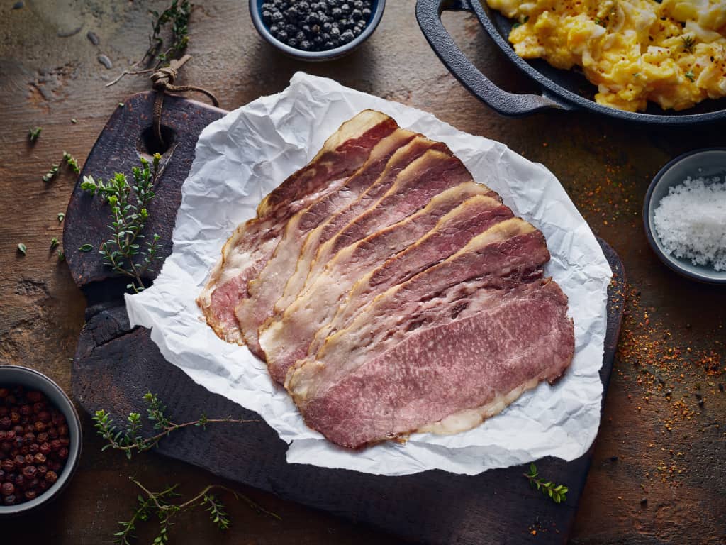 Pastrami ist gepökeltes, gewürztes und geräuchertes Rindfleisch. Zart, aromatisch und ideal für Sandwiches oder als Aufschnitt.