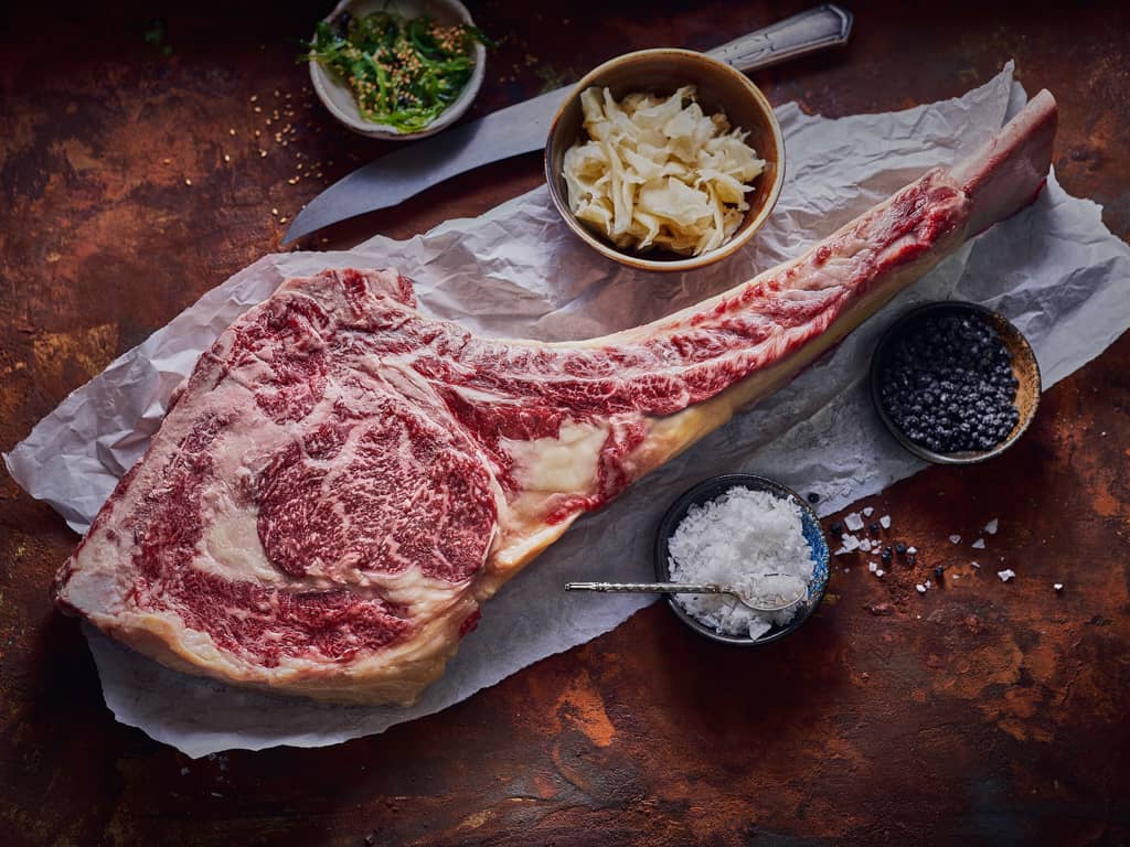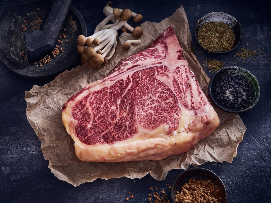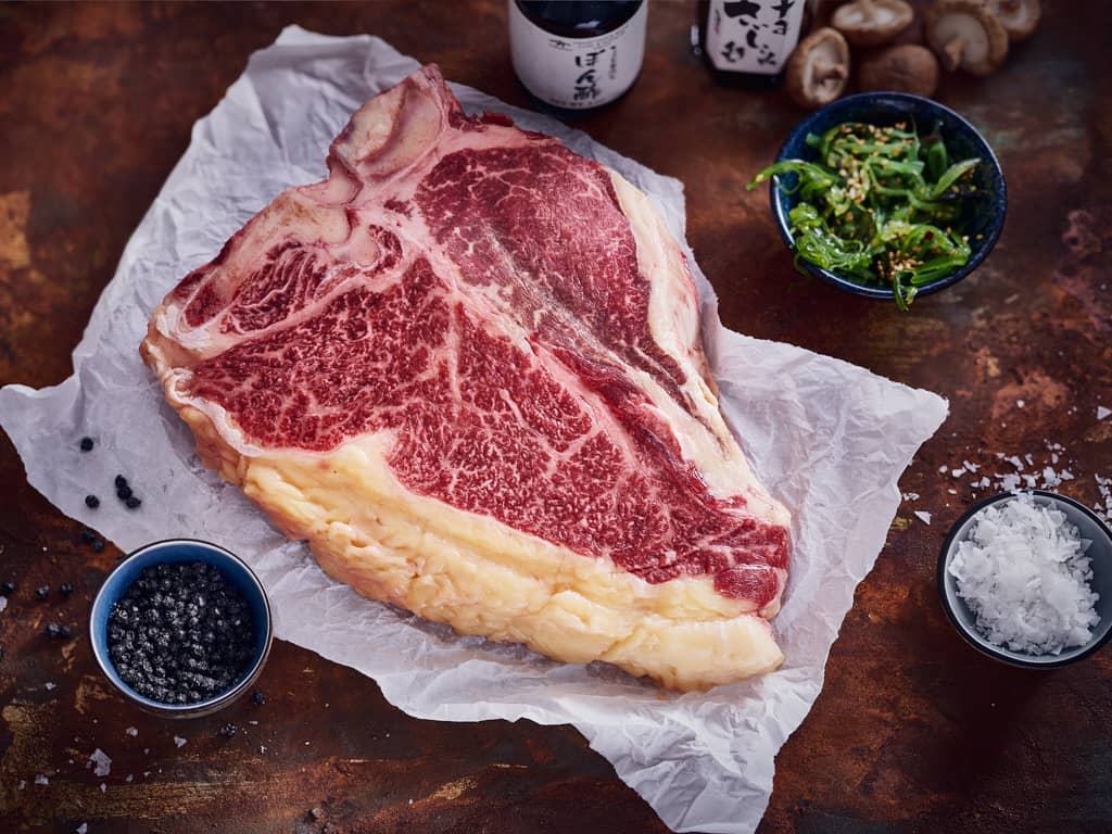 Das Porterhouse Steak vom Wagyu Rind setzt sich zusammen aus einem Teil Filet (mehr als 1,5cm Filetanteil) und einem Teil Roastbeef aus dem hinteren Rückenbereich. Getrennt sind die beiden Fleischstücke durch einen Knochen in T-Form.