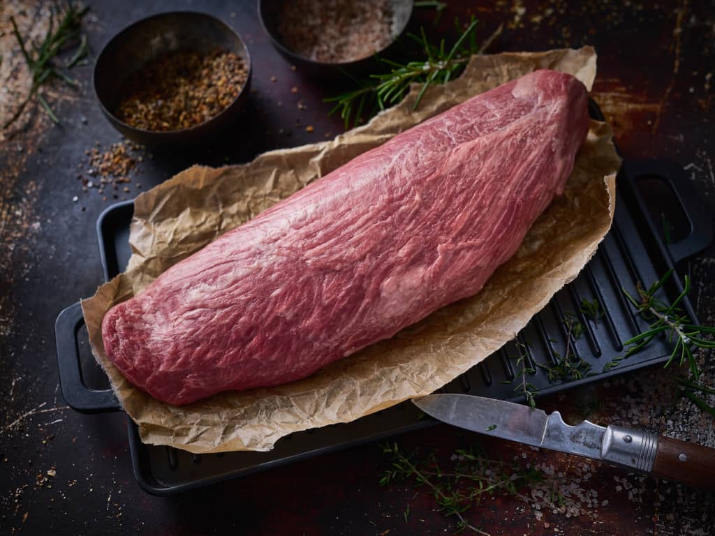 Das Filet ist eines der bekanntesten und vor allem zartesten Steak-Cuts. Es befindet sich unter der Wirbelsäule und dem Rückenmuskel und wird daher kaum beansprucht, was seine besondere Zartheit erklärt. Es ist mager, hat eine weiche Textur und ist von sehr feinen Fettadern durchzogen.